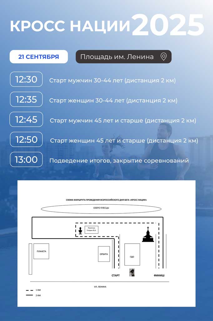 В воскресенье, 21 сентября, в Мирном будут проводиться легкоатлетические забеги, посвященные Всероссийскому дню бега «Кросс нации». Они пройдут в парковой зоне вдоль озера Плесцы. Старт и финиш – левая и правая сторона здания Дома офицеров (гарнизона).