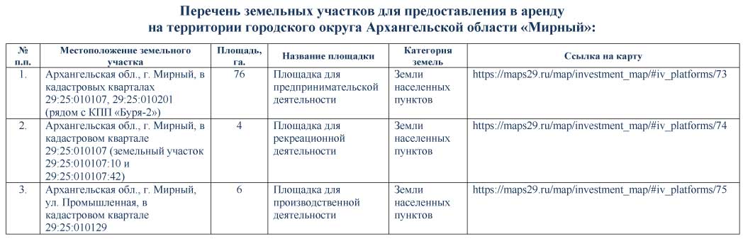 Инвестиционные площадки » Официальный сайт городского округа Архангельской области «Мирный»