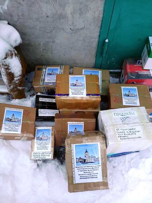 Прихожане храма Архистратига Михаила (г. Мирный) собрали 2 коробки с продуктами, 3 коробки с теплыми вещами, коробку с упаковками влажных салфеток и 8 коробок с духовными книгами для трех православных храмов г. Лисичанска; члены местной организации «Боевое братство» - 9 коробок расходных материалов для работы БПЛА.